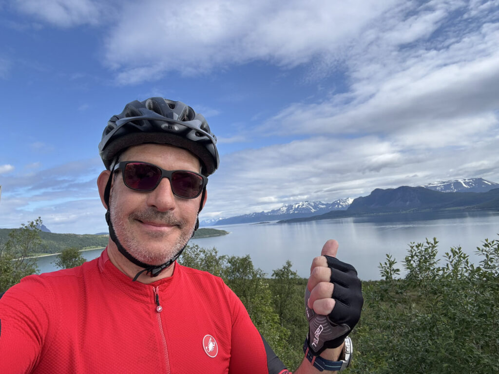 Vandaag voelde het landschap ‘normaal’. Niet meer elke besneeuwde berg op de foto. Pas later besefte ik dat het nog steeds indrukwekkend was, maar dat je snel gewend raakt. De vliegen waren er volop, de belofte was ingelost. Een warme dag, minder klimmen, wachten op de pont in een gezellig café dat duidelijk niet-Noors was, gerund door een grappige buitenlander.